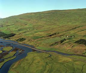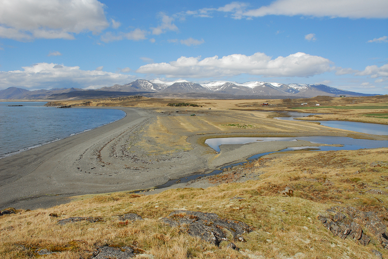 Der Hafen von Búðasandur, Hvalfjörður, Island. Die Überreste eines Handelsplatzes befinden sich in der Bildmitte, das mittelalterliche Hafengebiet (rechts) ist heute versandet (Foto N. Mehler).
